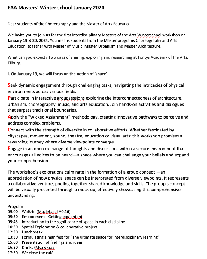 Wat een inspirerende dag was het vandaag! Samen met alle masterstudenten hebben we deelgenomen aan een boeiende samenwerkingsactiviteit. We werden ingedeeld in groepjes van ongeveer 10 tot 12 studenten. De opdracht was om gezamenlijk een interdisciplinaire ruimte te creëren en deze in de middag als een manifest te presenteren. We hadden onze ruimte waar we in zaten een ieder geobserveerd en gekeken wat je met de ruimte die je gekozen had kon doen, of niet kon doen, wat voelde je, wat ervaarde je. Zo zijn we stap voor stap tot ons manifest gekomen I.I.S.